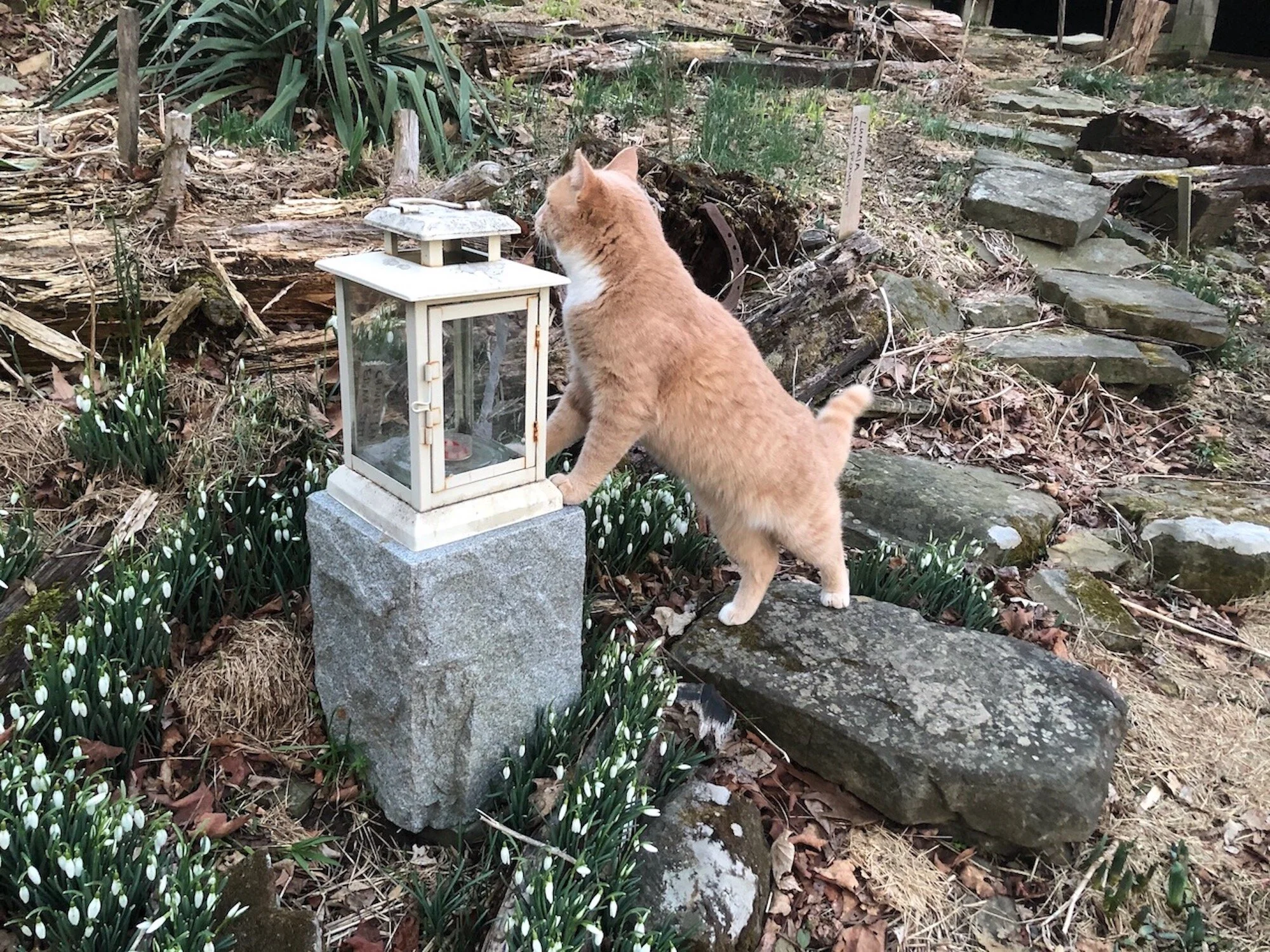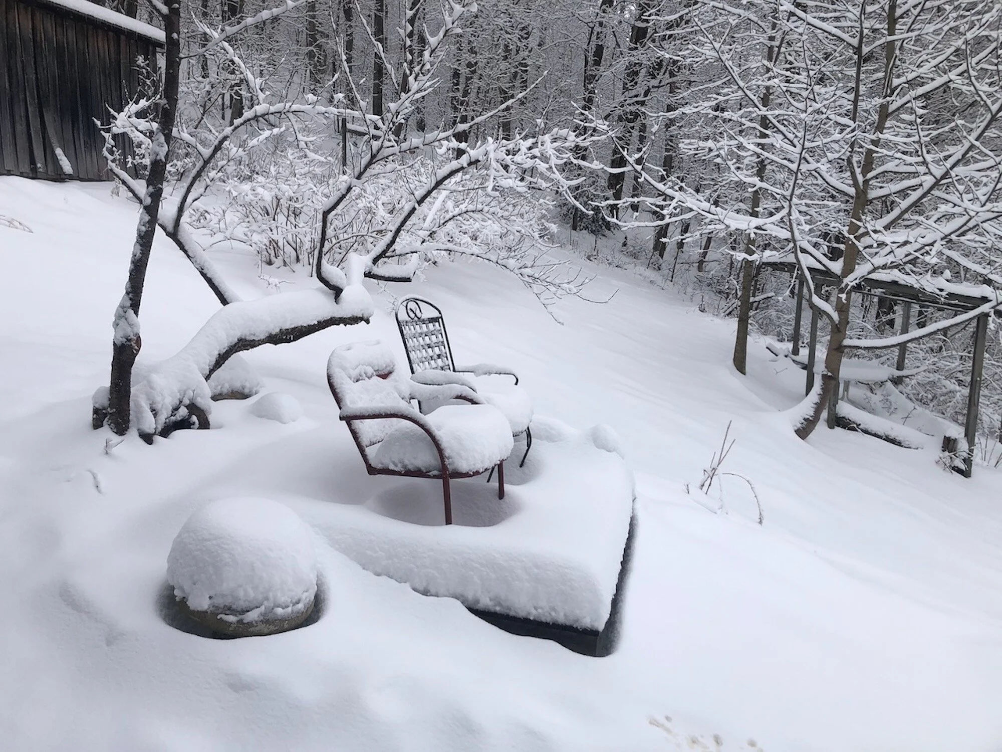 East side of Carter House in February. The Legacy Garden anchors on the west side of the house, but continues across the property, creating punctuations of plantings and views like this snow covered platform on the east side of the house canopied by an ornamental peach tree. Barbara Carter says those white peaches were never any good, and she’s right, but the tree is lovely.